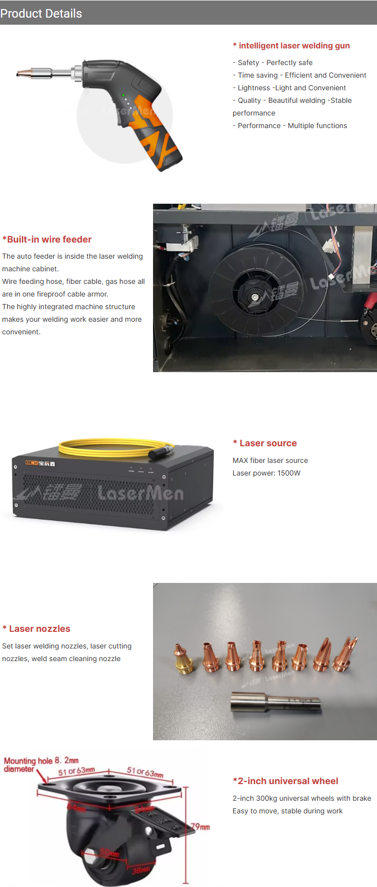 | Working modes | Welding: wobble, welding width 5mm Cutting Weld bead cleaning: width 5mm Cleaning: width 120mm |